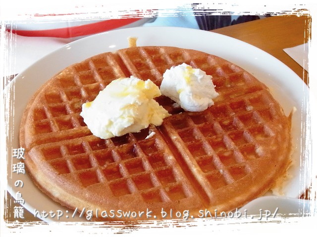 円形のアメリカンワッフルにメープルシロップをかけて頂きます。