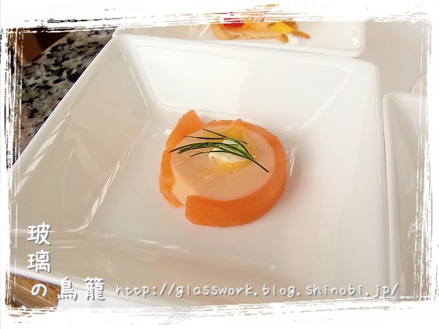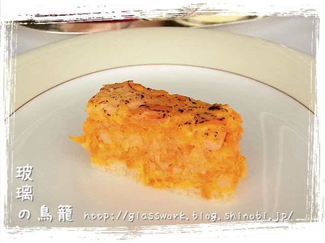 左上がサーモンのパテ、右上がキッシュ、下がカボチャのムースみたいなもので、