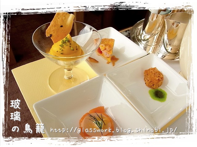 左上がサーモンのパテ、右上がキッシュ、下がカボチャのムースみたいなもので、