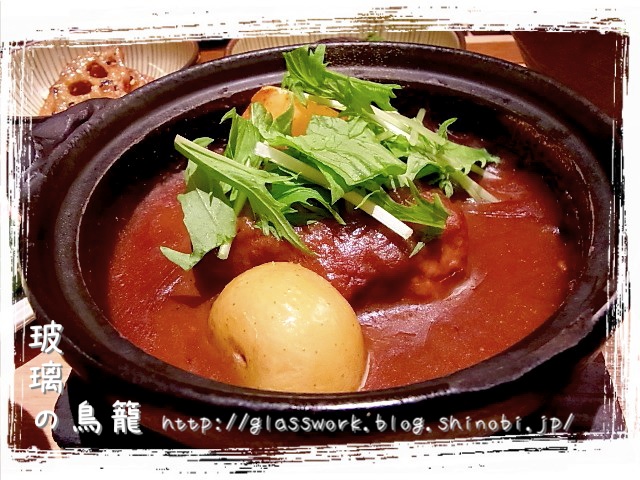 土鍋でたっぷりのデミグラスソースに浸って出て来ました。