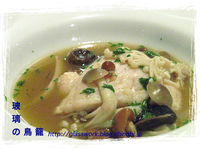 次はメインその1、魚料理で「白身魚のヴァプール きのこのスープ仕立て」。